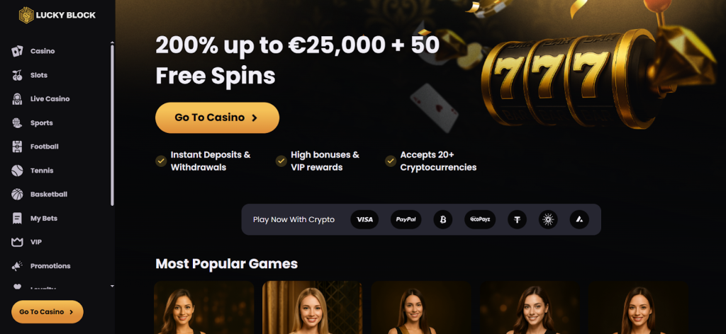 Alt text: Lucky Block no kyc casino new zealand with Telegram integration and 25000 euro welcome bonus.
