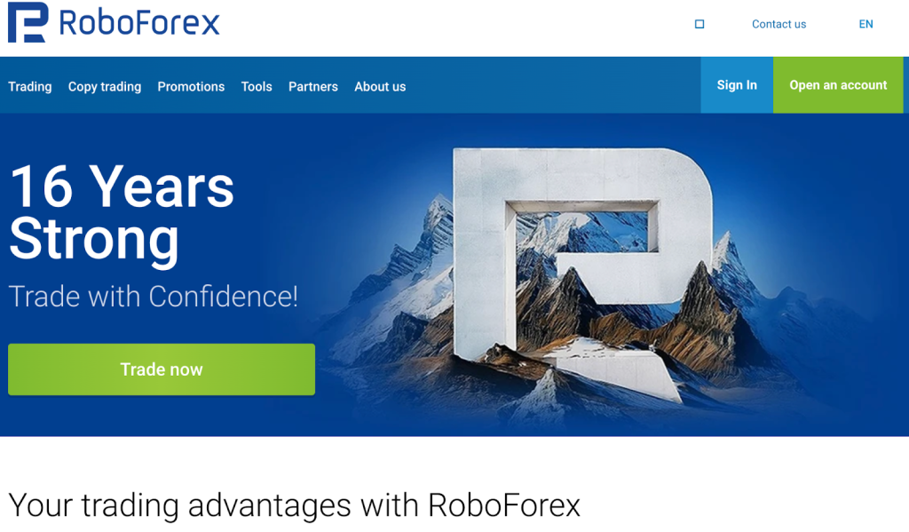 Alt text: Roboforex homepage featuring multi-jurisdictional MT broker with diverse account types, CopyFX social trading, automated RoboX platform and 20+ crypto CFDs on MetaTrader.